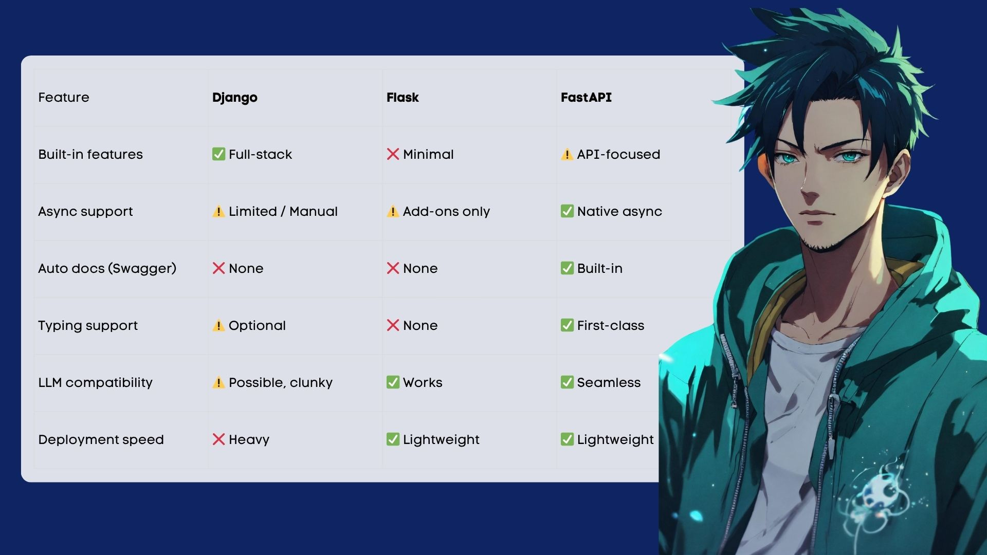 FastAPIfor buildingDjango,when I need structureuvfor envsDocker+Fly.ioorRenderfor deploymentObservability from Day 1